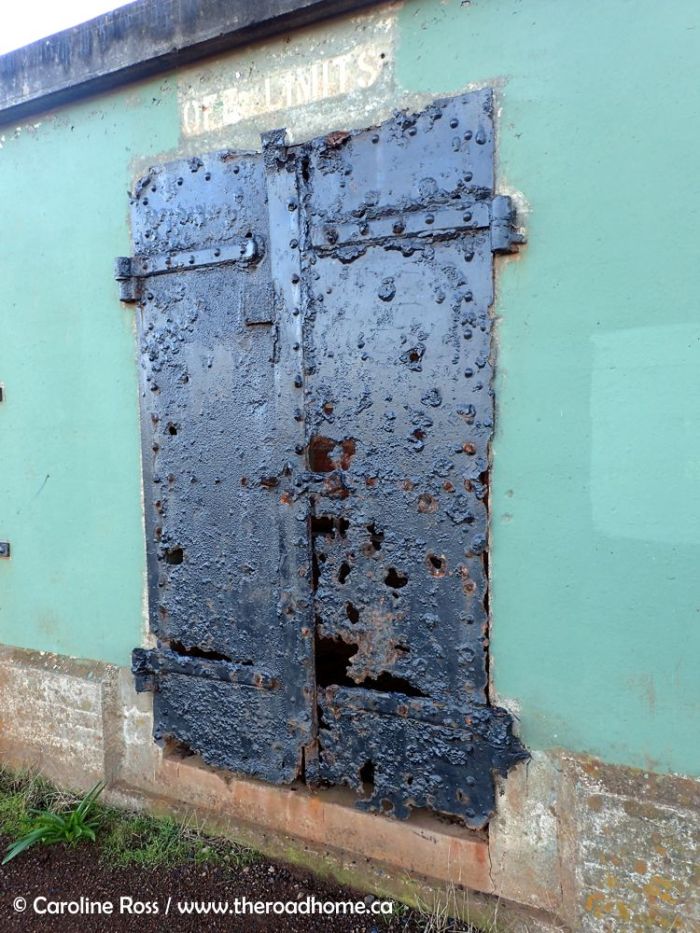 - The weathered door to Battery Mendell’s plotting room, where trained crew made the calculations necessary to accurately aim the big guns. Photo: Caroline Ross / The Road Home