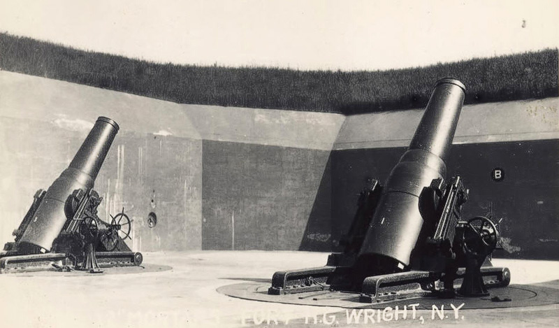 Battery Alexander featured eight 12″ breech-loading mortars like these on Fisher’s Island, New York (photo circa 1915). Each mortar could pivot on its housing and swivel on its base. Photo: Adelard T. LeGere, Post Photographer for Fort H.G. Wright, Matt Edwards Collection, Coast Defense Study Group, Public Domain, https://commons.wikimedia.org/w/index.php?curid=18193943