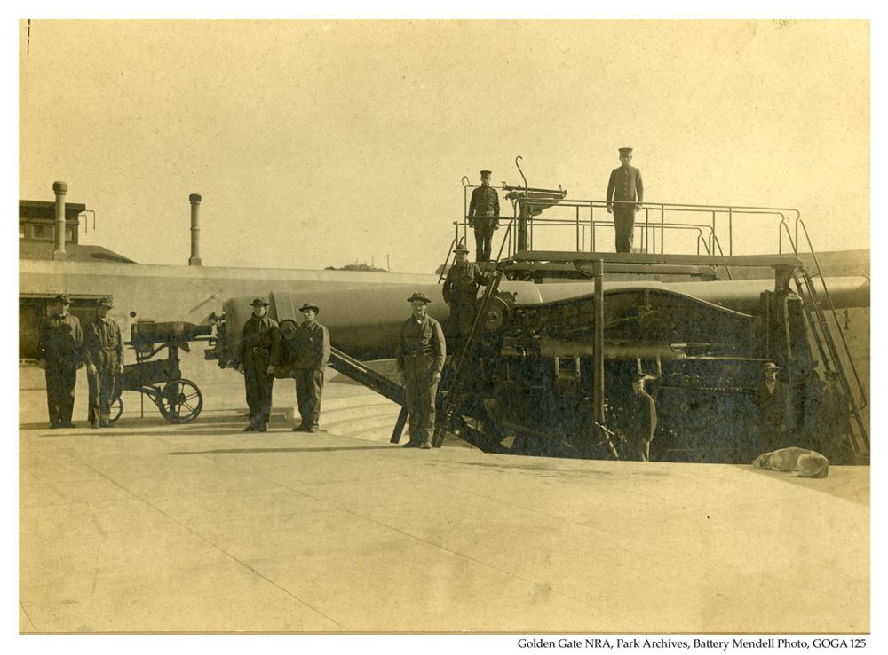 Crew at Battery Mendell, 1909-1912. Published February 17, 2018 at 1000 × 738 in Guns and ghosts: Rambling through the ruins of early 20th century gun batteries in California’s Marin County ← Previous Next → Soldiers pose with one of Battery Mendell’s big disappearing guns, circa 1909-1912. Photo: GGNRA, Park Archives, GOGA 125