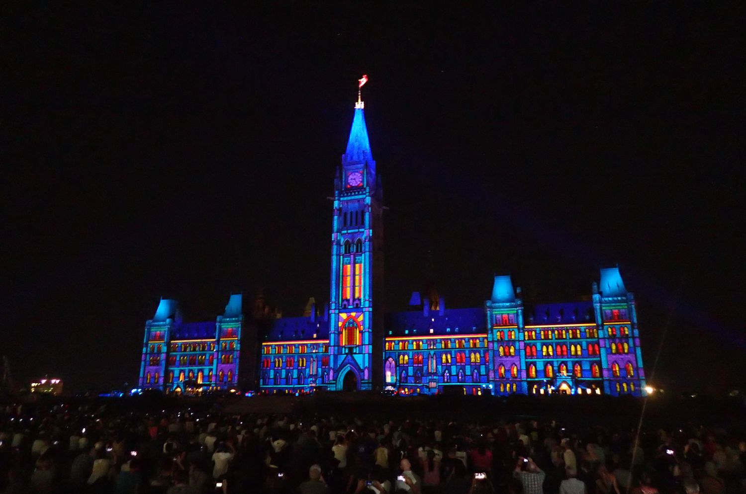 The Peace Tower and Centre Block blaze with colour during the 2018 Northern Lights sound and light show. (Photo: Caroline Ross, The Road Home.)